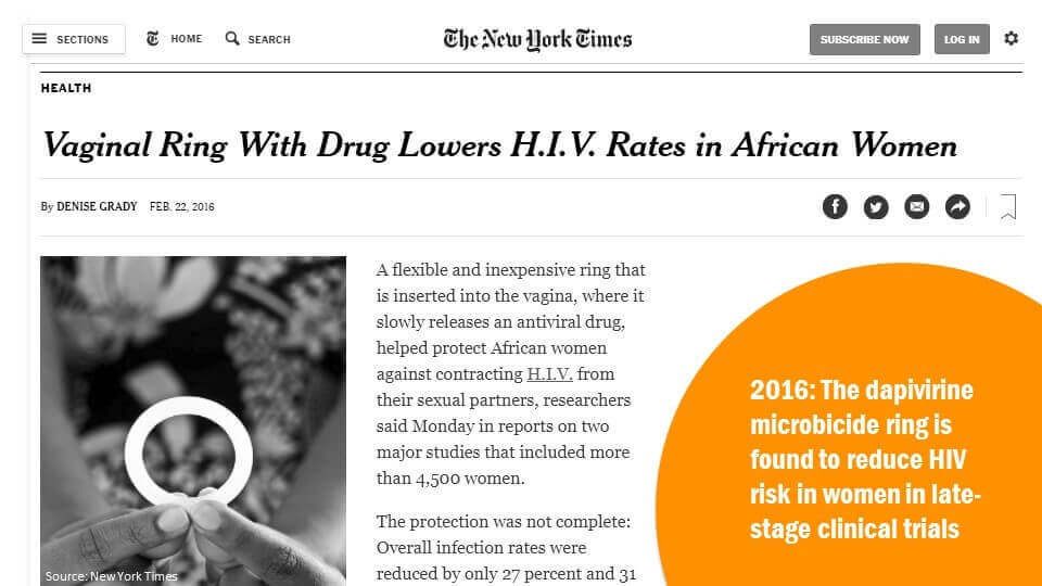 The partnership has advanced a new woman-center HIV prevention tool: a monthly, vaginal microbicide ring that deliver antiretroviral drugs. The groundbreaking