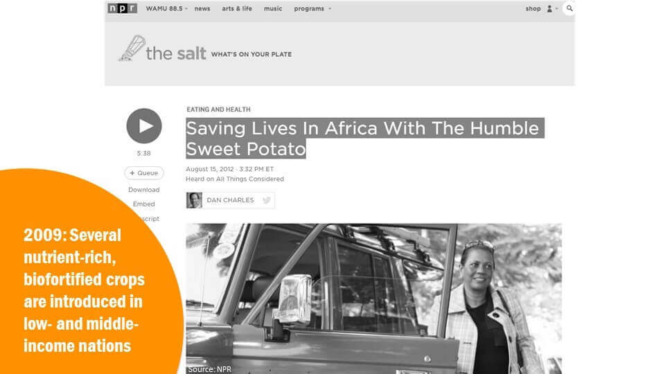 crops so they are rich in micronutrients. After years of proof of concept research, in 2009, the nonprofit he founded—GHTC member HarvestPlus—introduced