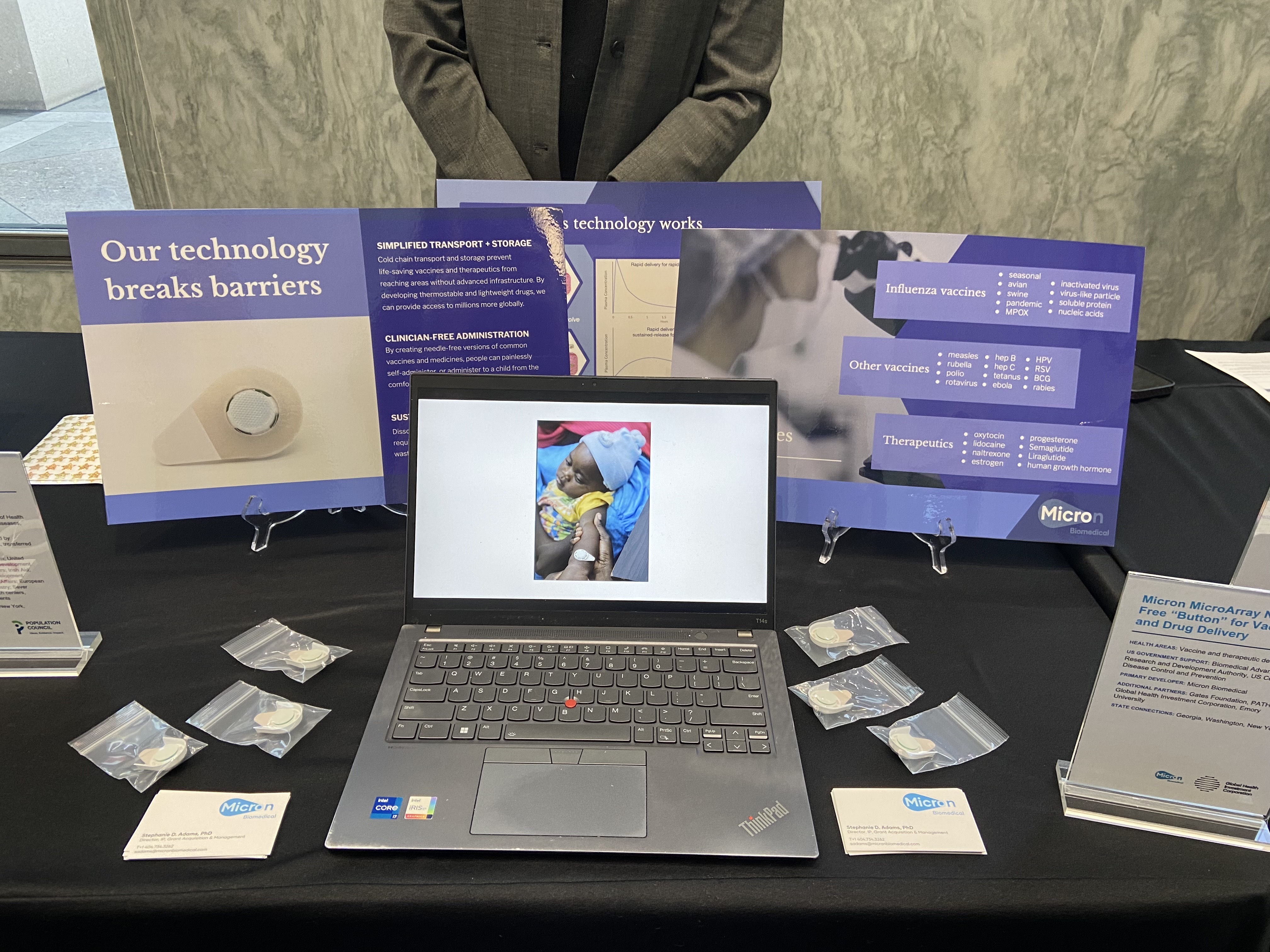 | Micron Biomedical, based in Georgia, developed a microarray needle-free “button” that could one day be used for delivering vaccines and pharmaceuticals without the need for traditional injections. This innovative, pain-free solution could be self-administered, reducing barriers to vaccination and treatment. It also limits or eliminates the need for refrigerated storage, simplifies transport and storage, and produces no sharps waste, making it especially valuable for low-resource settings. This technology received US funding support from CDC and BARDA (through the New York-based Global Health Investment Corporation) and was developed in partnership with other US-based groups, including the Gates Foundation, PATH, and Emory University in Georgia.